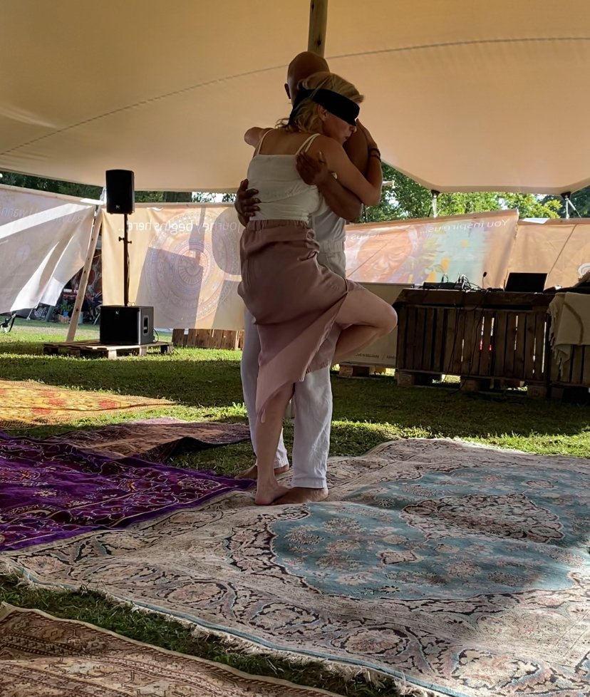 De blinddoek verdiept het contact: de leider stapt in zijn of haar mannelijke energie: richting, focus en helderheid, terwijl de volger zich opent voor vrouwelijke energie: overgave, zachtheid en ontvankelijkheid.
