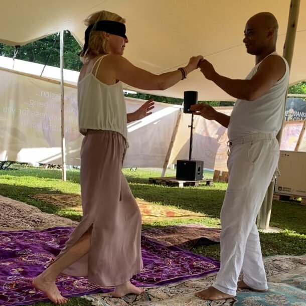 Eén persoon leidt, de ander danst geblinddoekt en geeft zich over aan het moment.